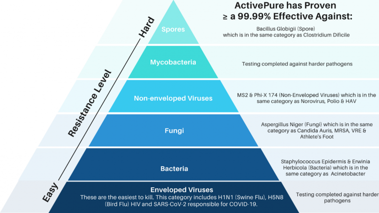 Η τεχνολογία ActivePure έχει αποδειχθεί αποτελεσματική έναντι ενός ευρέος φάσματος κλινικά σχετικών παθογόνων. Κάθε παθογόνο έχει ένα διαφορετικό επίπεδο αντίστασης που περιγράφεται στην ιεραρχία των παθογόνων όπως φαίνεται στο παραπάνω διάγραμμα. Αυτή η ιεραρχία χρησιμοποιείται για να βοηθήσει στην πρόβλεψη της ικανότητας μιας συσκευής ή μιας χημικής ουσίας να σκοτώνει ένα αναδυόμενο παθογόνο.